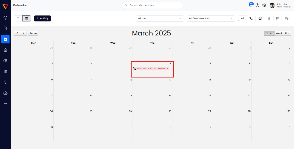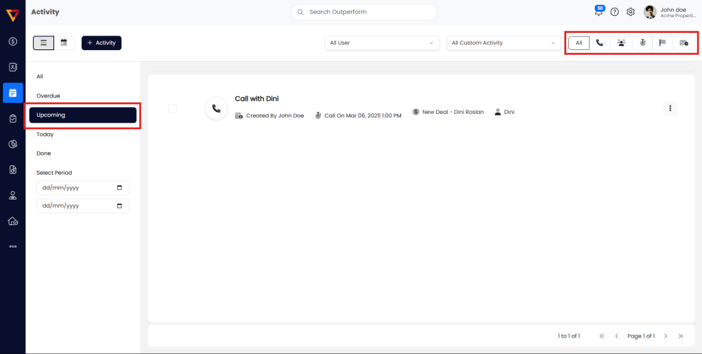 2. On the top right of the Activities page, you can apply the activity filter (call, meeting, task, deadline, and email) to minimize your finding.