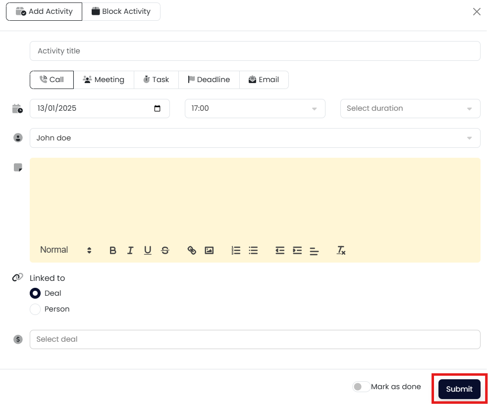 - Choose either Deal or People from the Select Link to dropdown. Type in the deal name or people name on the given field. Linking the activity to deal will affect the deal you typed in and linking the activity to people will affect the people you typed in.