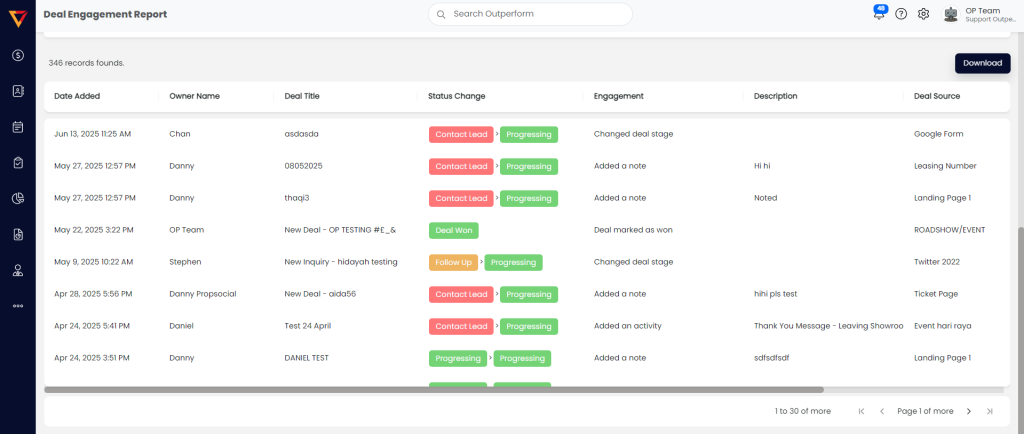 - Status Change – Shows how the deal’s stage changed (e.g., Contact Lead➝ Progressing).