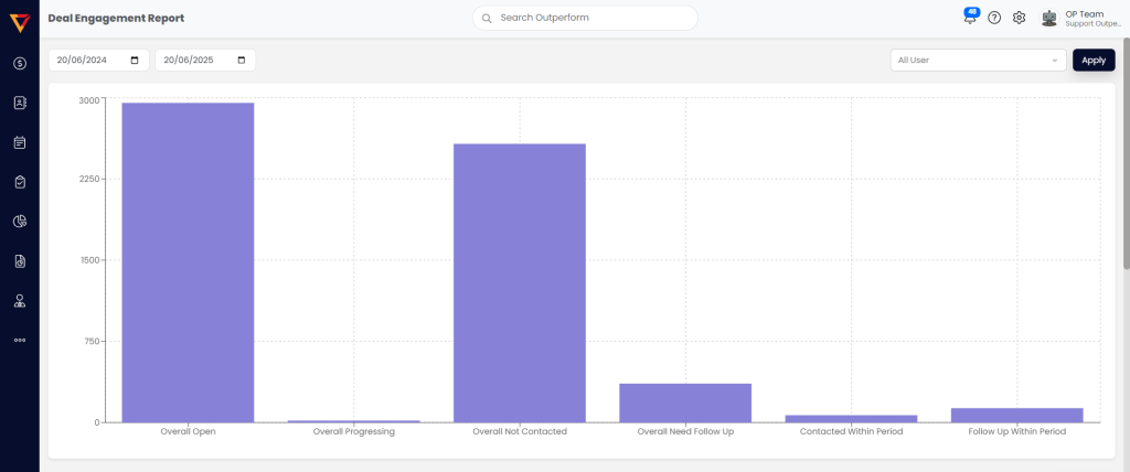 Deal Engagement is a report page that records all deals progress in a system such as deal open, progressing, not contacted, need follow up, contacted within the period, and followed up within period.
