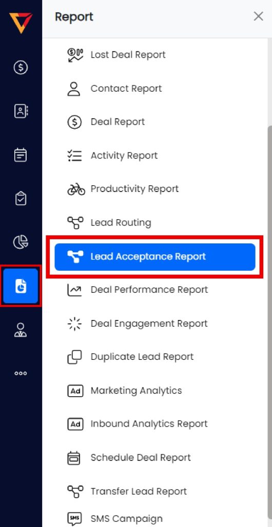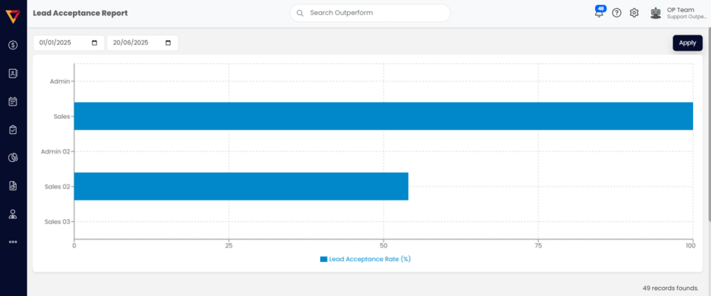 Lead Acceptance is a report page that keeps track of all leads that users accept and provides a graph for viewing. The calculation is based on Lead Accepted over Inbound Leads times 100%.