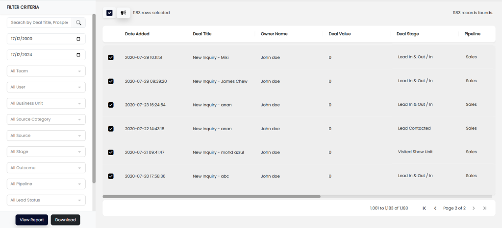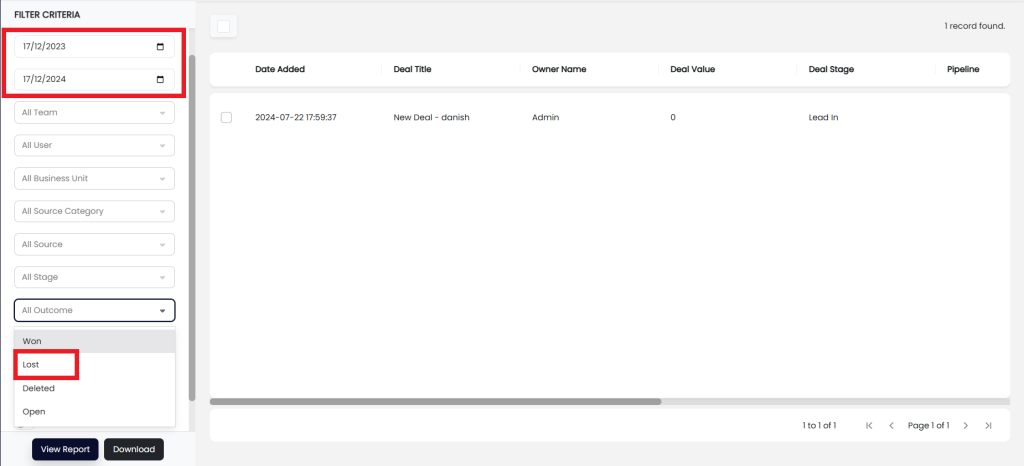 Step 2: Tweak the Date filter to search the deal and choose lost from All Outcome filter. Next, click on the View Report button