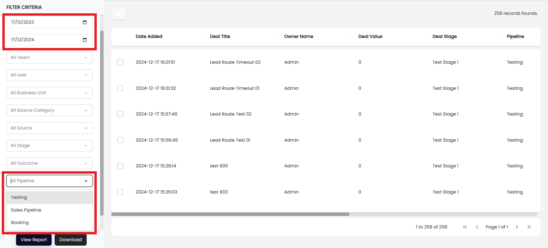 Step 2: Tweak the date and pipeline filter (disregard the pipeline filter if you want to view deal for all pipeline). Click on the View Report button to generate the report. (You can tweak any necessary filter to see the desired deal)