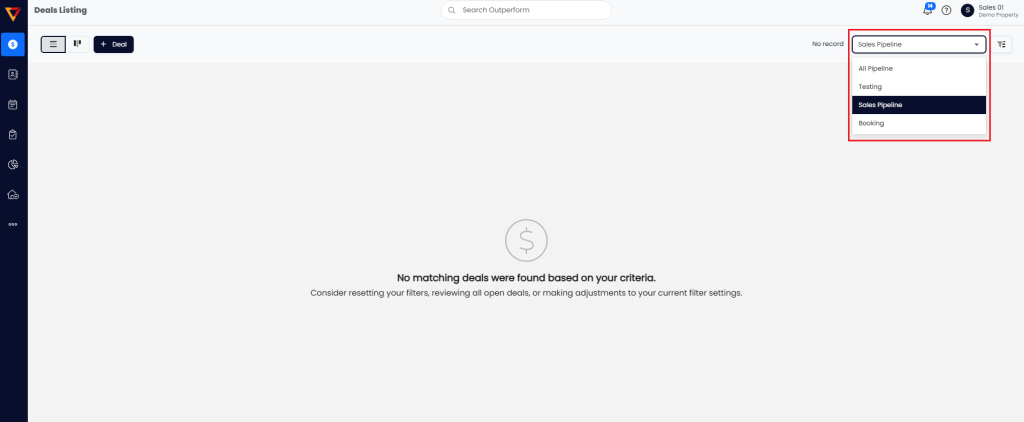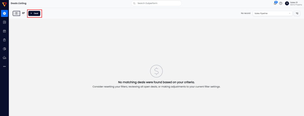 - Once pipeline is confirmed. click on “Add Deal” button from the Deal Menu.