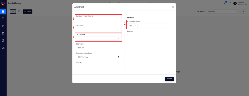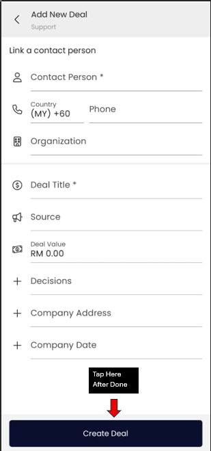- By Default, Deal Title will be auto filled in according to Contact Person Name, but you are still able to amend them.