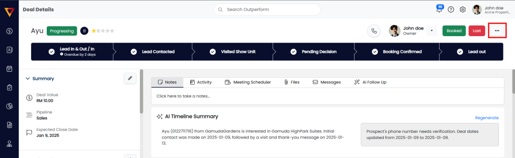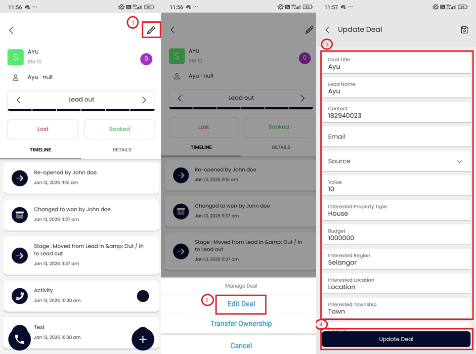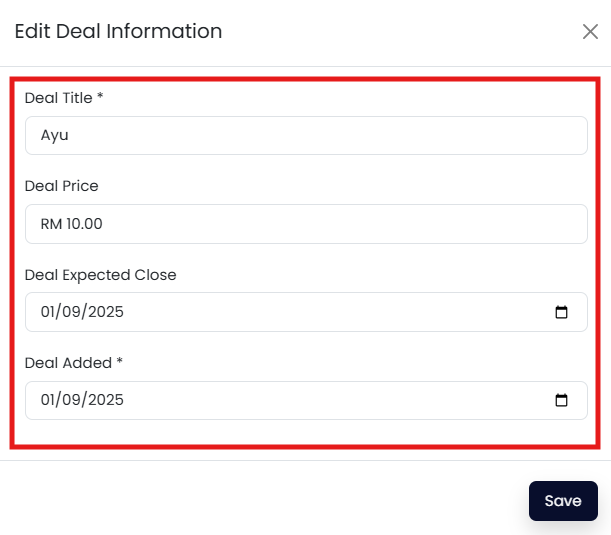 • Edit the deal title, lead name, contact, email address, select source, deal value and click on the icon save button or update deal button.